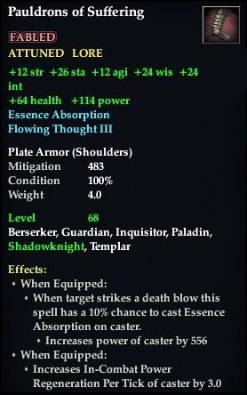 Pauldrons of Suffering 76,461 pages on this wiki Edit Edit source History Talk 0 In-Game Examine Window Pauldrons of Suffering other resources EQ2U · LootDB · EQ2LL · ZAM · Census xml Pauldrons of Suffering FABLED ATTUNEABLE LORE +12 str +12 agi +24 wis +24 int +26 sta Essence Absorbtion Flowing Thought III Plate Armor ( Shoulders ) Mitigation 483 Level 68 ( Tier 7 ) Berserker , Guardian , Inquisitor , Paladin , Shadowknight , Templar Effects: Applies Essence Absorbtion when Equipped When target strikes a death blow this spell has a 10% chance to cast Essence Absorption on caster. Increases power of caster by 556 Applies Flowing Thought III when Equipped Increases In-Combat Power Regeneration Per Tick of caster by 3.0