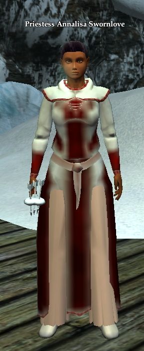 | Priestess Annalisa Swornlove was killed during the events of A Goddess Risen ( LU62 ). Her brother Priest Aaronolis Swornlove has taken her place. |