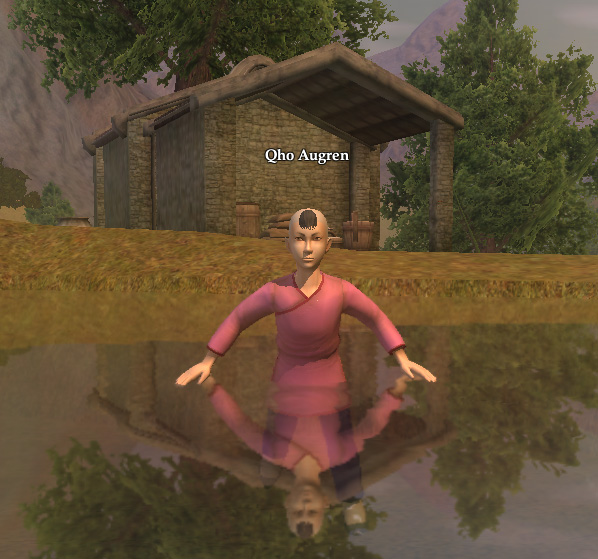 - Qho is the NPC that many people love to hate, because he offers a very long quest series that can be extremely time-consuming if his quest is the only one you are working on in a given zone. For this reason, it's wise to visit him in The Village of Shin where he swims in a pond at ( -13, 10, -108 ) /waypoint -13.25, 9.87, -108.48 as soon as you create a new character; doing so will make it easy to stop and harvest (the purpose of most of his quests) as you progress through various zones for adventure quests.