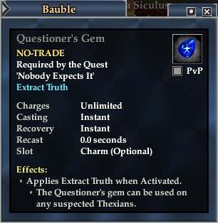 Questioner's Gem 76,461 pages on this wiki Edit Edit source History Talk 0 In-Game Examine Window Questioner's Gem other resources EQ2U · LootDB · EQ2LL · ZAM · Census xml Questioner's Gem NO-TRADE Required by the Quest ' Nobody Expects It ' Extract Truth Charges Unlimited Casting Instant Recovery Instant Recast 0.0 seconds Slot Charm Effects: Applies Extract Truth when Activated. The Questioner's Gem can be used on any suspected Thexians.