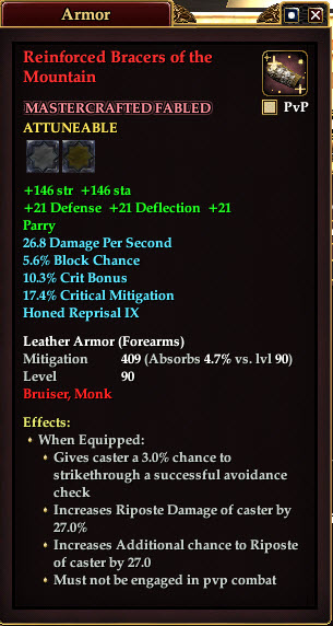 Reinforced Bracers of the Mountain 76,461 pages on this wiki Edit Edit source History Talk 0 In-Game Examine Window Reinforced Bracers of the Mountain other resources EQ2U · LootDB · EQ2LL · ZAM · Census xml Reinforced Bracers of the Mountain MASTERCRAFTED FABLED ATTUNEABLE +146 str +146 sta +21 Defense +21 Deflection +21 Parry 26.8 Damage Per Second 5.6% Block Chance 10.3% Crit Bonus Honed Reprisal IX Leather Armor ( Forearms ) Mitigation 409 Level 90 ( Tier 10 ) Bruiser , Monk Effects: When Equipped: Gives the caster a 3.0% chance to strikethrough a successful avoidance check Increases Riposte Damage of caster by 27.0% Increases Additional chance to Riposte of caster by 27.0% Must not be engaged in pvp combat