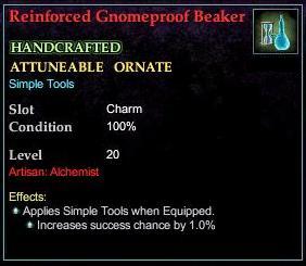 Reinforced Gnomeproof Beaker 76,461 pages on this wiki Edit Edit source History Talk 0 In-Game Examine Window Reinforced Gnomeproof Beaker other resources EQ2U · LootDB · EQ2LL · ZAM · Census xml Reinforced Gnomeproof Beaker HANDCRAFTED ATTUNEABLE Simple Tools Slot Charm (Optional) Level 20 ( Tier 3 ) Effects: Applies Simple Tools when Equipped. Increases success chance by 1.0%