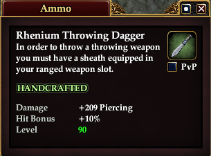 Rhenium Throwing Dagger 76,461 pages on this wiki Edit Edit source History Talk 0 In-Game Examine Window Rhenium Throwing Dagger other resources EQ2U · LootDB · EQ2LL · ZAM · Census xml EverQuest II Ammo Information Rhenium Throwing Dagger In order to throw a throwing weapon you must have a sheath equipped in your ranged weapon slot. HANDCRAFTED Damage +209 Piercing Hit Bonus +10% Level 90 ( Tier 10 )