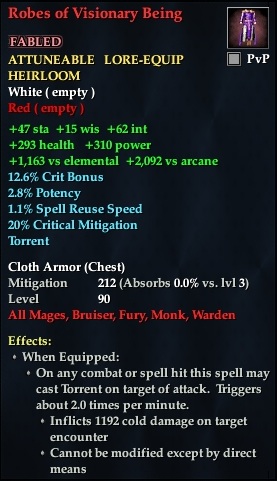 Robes of Visionary Being 76,461 pages on this wiki Edit Edit source History Talk 0 In-Game Examine Window Robes of Visionary Being other resources EQ2U · LootDB · EQ2LL · ZAM · Census xml Robes of Visionary Being FABLED +15 wis +62 int +47 sta +1,163 vs elemental +2,092 vs arcane 12.6% Crit Bonus 2.8% Potency 1.1% Spell Reuse Speed Torrent Cloth Armor ( Chest ) Mitigation 212 Level 90 ( Tier 10 ) All Mages , Bruiser , Monk , Fury , Warden Effects: When Equipped: On any combat or spell hit this spell may cast Torrent on target of attack. Triggers about 2.0 times per minute. Inflicts 1192 cold damage on target encounter Must not be engaged in pvp combat Cannot be modified except by direct means Must not be engaged in pvp combat This item may not be used in a PvP zone.