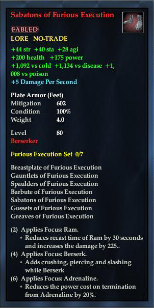Sabatons of Furious Execution 76,461 pages on this wiki Edit Edit source History Talk 0 In-Game Examine Window Sabatons of Furious Execution other resources EQ2U · LootDB · EQ2LL · ZAM · Census xml Sabatons of Furious Execution FABLED LORE NO-TRADE +44 str +28 agi +40 sta +1,092 vs elemental +1,134 vs noxious 5 Damage Per Second Plate Armor ( Feet ) Mitigation 602 Level 80 ( Tier 9 ) Berserker Obtain: Purchased from Avess Ryiss at Danak Shipyard in the Jarsath Wastes for a Scorched Boots Pattern and 3 Lava Ruby . \aITEM 1496915256 1487740963:Sabatons of Furious Execution\/a \aITEM 1496915256 1487740963:Sabatons of Furious Execution\/a What does this information mean? Armor Set: Furious Execution Barbute of Furious Execution Breastplate of Furious Execution Spaulders of Furious Execution Gussets of Furious Execution Gauntlets of Furious Execution Greaves of Furious Execution Sabatons of Furious Execution (2) Applies Focus: Demolish IV . Reduces recast time of Demolish IV by 30 seconds and increases the damage by 225.. (4) Applies Focus: Berserk . Adds crushing, piercing and slashing while Berserk. (6) Applies Focus: Adrenaline . Reduces the power cost on termination from Adrenaline by 20% of the original value.