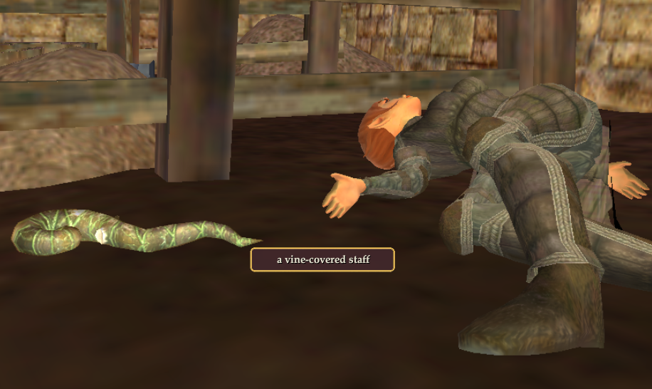 - To spawn: collect the vine covered staff next to the dead body in the stable at ( 32, 0, -2 ) /waypoint 32, 0, -2 .