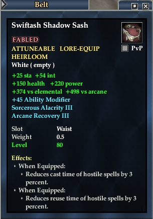 Swiftash Shadow Sash 76,461 pages on this wiki Edit Edit source History Talk 0 In-Game Examine Window Swiftash Shadow Sash other resources EQ2U · LootDB · EQ2LL · ZAM · Census xml Swiftash Shadow Sash FABLED ATTUNEABLE LORE-EQUIP HEIRLOOM +54 int +25 sta +374 vs elemental +498 vs arcane +45 Ability Modifier Sorcerous Alacrity III Arcane Recovery III Slot Waist Level 80 ( Tier 9 ) Effects: When Equipped: Reduces cast time of hostile spells by 3 percent. When Equipped: Reduces reuse time of hostile spells by 3 percent.
