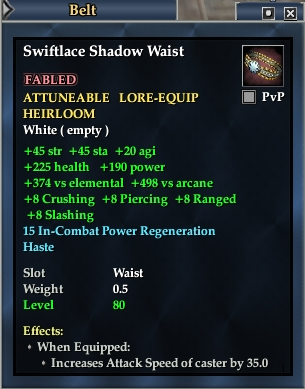 Swiftlace Shadow Waist 76,461 pages on this wiki Edit Edit source History Talk 0 In-Game Examine Window Swiftlace Shadow Waist other resources EQ2U · LootDB · EQ2LL · ZAM · Census xml Swiftlace Shadow Waist FABLED ATTUNEABLE LORE-EQUIP HEIRLOOM +45 str +20 agi +45 sta +374 vs elemental +498 vs arcane +8 Crushing +8 Piercing +8 Ranged +8 Slashing 15 In-Combat Power Regeneration Per Tick Haste Slot Waist Level 80 ( Tier 9 ) Effects: When Equipped: Increases Attack Speed of caster by 35.0
