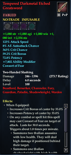 Tempered Darkmetal Etched Greatsword 76,461 pages on this wiki Edit Edit source History Talk 0 In-Game Examine Window Tempered Darkmetal Etched Greatsword other resources EQ2U · LootDB · EQ2LL · ZAM · Census xml Tempered Darkmetal Etched Greatsword FABLED NO-TRADE INFUSABLE +1,080 str +1,080 agi +1,080 wis +1,080 int +2,356 sta 123% Attack Speed 8% AE Autoattack Chance 363% Crit Chance 59.2% Crit Bonus 72.8% Potency +7,802 Ability Modifier Consort of Fear Great Sword Two-Handed Slashing Damage 246-1396 (273.7 Rating) Delay 6.0 seconds Level 100 ( Tier 11 ) Berserker , Guardian , Paladin , Shadowknight , Fury , Warden , Beastlord , Channeler Effects: When Equipped: Increases Crit Bonus of caster by 35.0% Increases Potency of caster by 35.0% On any combat or spell hit this spell may cast Consort of Fear on target of attack. Lasts for 30.0 seconds. Triggers about 1.8 times per minute. Summons two thulian assassins with low health. They will deal high damage if positioned behind their target. Summons one thulian shadowknight with high health and a stacking strength tap spell. Cannot be modified except by direct means This effect can only trigger once every 30.0 seconds. This item may not be used in a PvP zone.