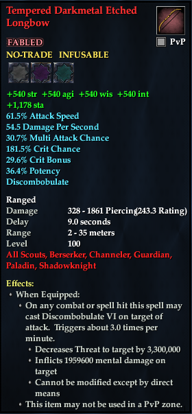 Tempered Darkmetal Etched Longbow 76,461 pages on this wiki Edit Edit source History Talk 0 In-Game Examine Window Tempered Darkmetal Etched Longbow other resources EQ2U · LootDB · EQ2LL · ZAM · Census xml Tempered Darkmetal Etched Longbow FABLED NO-TRADE INFUSABLE +540 str +540 agi +540 wis +540 int +1,178 sta 61.5% Attack Speed 54.5 Damage Per Second 30.7% Multi Attack Chance 181.5% Crit Chance 29.6% Crit Bonus 36.4% Potency Discombobulate Bow Ranged Damage 328-1,861 (243.3 Rating) Delay 9 seconds Range 2-35 meters Level 100 ( Tier 11 ) All Scouts , Berserker , Guardian , Paladin , Shadowknight , Channeler Effects: When Equipped: On any combat or spell hit this spell may cast Discombobulate VI on target of attack. Triggers about 3.0 times per minute. Decreases Threat to target by 3,300,000 Inflicts 1959600 mental damage on target Cannot be modified except by direct means This item may not be used in a PvP zone.