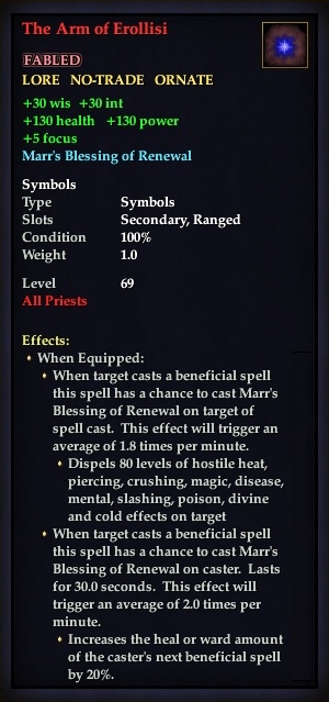 When target casts a beneficial spell this spell has a chance to cast Marr's Blessing of Renewal on target of spell cast. This effect will trigger an average of 1.8 times per minute.