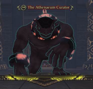 The Curator will leash if you fight him outside the door. During the battle, he will periodically (every 30 seconds) port himself back to his starting point in the center of the room and root there until he lets off a crushing AE called Earthquake. The AE is line of sight only, so fighting him in a corner with a pillar between where he ports to is safe. Earthquake will hit for 12-18k crushing damage, depending on gear.