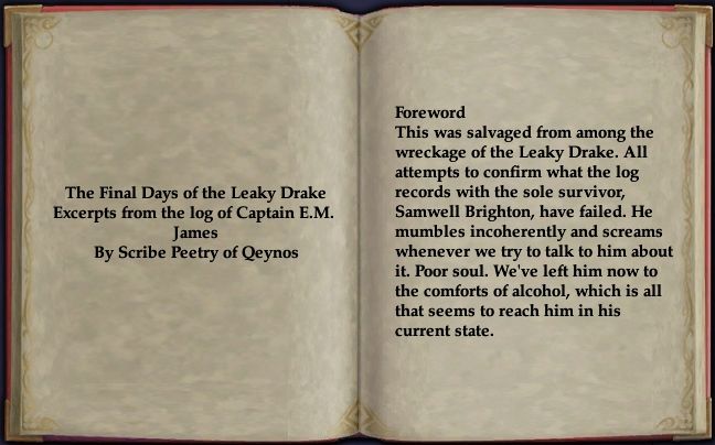 The Final Days of the Leaky Drake 76,461 pages on this wiki Edit Edit source History Talk 0 In-Game Examine Window The Final Days of the Leaky Drake other resources EQ2U · LootDB · EQ2LL · ZAM · Census xml EverQuest II Item Information Type : House Item Subtype : Book The Final Days of the Leaky Drake This book appears to have been hastily bound into leaflets for wide spread distribution. LORE NO-TRADE NO-VALUE Obtain: Reward from the quest " Qeynos Harbor Rumor Mill ." What does this information mean? Categories : Items House Item (Item Type) Book (Item Subtype) Articles missing itemlink Item pages with existing default images Add category Cancel Save