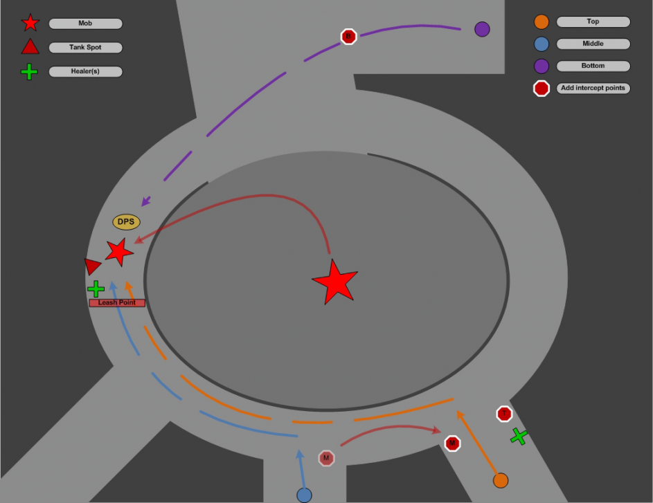 This is straight tank in place and hold aggro. The location chosen in the diagram was selected for a myriad of reasons. It is central to the encounter so it is both the shortest distance for raiders to run to pick up the adds, as well as the furthest distance for the adds to traverse to get to the named. Engaging the mob at this location also decreased the potential damage done to the raid force by the initial AE double tap. The trickery is pretty standard if the Main tank gets marked off tank must be prepared to pick it up fast.