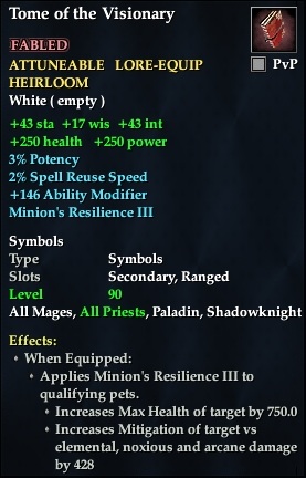 Tome of the Visionary 76,461 pages on this wiki Edit Edit source History Talk 0 In-Game Examine Window Tome of the Visionary other resources EQ2U · LootDB · EQ2LL · ZAM · Census xml Tome of the Visionary FABLED ATTUNEABLE LORE-EQUIP HEIRLOOM +17 wis +43 int +43 sta 3% Potency 2% Spell Reuse Speed +146 Ability Modifier Minion's Resilience III Symbols Type Symbols Slots Secondary, Ranged Level 90 ( Tier 10 ) All Mages , All Priests , Paladin , Shadowknight Effects: When Equipped: Applies Minion's Resilience III to qualifying pets. Increases Max Health of target by 750.0 Increases Mitigation of target vs elemental, noxious and arcane damage by 428.