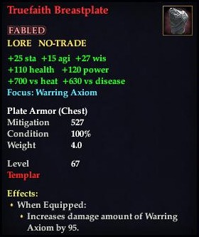 Truefaith Breastplate 76,461 pages on this wiki Edit Edit source History Talk 0 In-Game Examine Window Truefaith Breastplate other resources EQ2U · LootDB · EQ2LL · ZAM · Census xml Truefaith Breastplate FABLED LORE NO-TRADE +15 agi +27 wis +25 sta +700 vs elemental +630 vs noxious Plate Armor ( Chest ) Mitigation 527 Level 67 ( Tier 7 ) Templar Effects: When Equipped: Increases In-Combat damage amount of Warring Axoim by 95