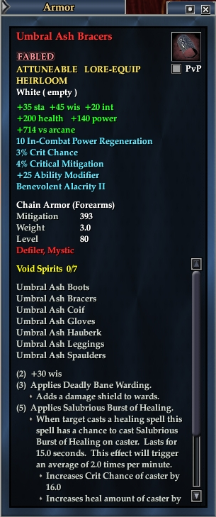 Umbral Ash Bracers 76,461 pages on this wiki Edit Edit source History Talk 0 In-Game Examine Window Umbral Ash Bracers other resources EQ2U · LootDB · EQ2LL · ZAM · Census xml Umbral Ash Bracers FABLED ATTUNEABLE LORE-EQUIP HEIRLOOM +45 wis +20 int +35 sta +714 vs arcane 10 In-Combat Power Regeneration Per Tick 3% Crit Chance +25 Ability Modifier Benevolent Alacrity II Chain Armor ( Forearms ) Mitigation 393 Level 80 ( Tier 9 ) Defiler , Mystic Effects: When Equipped: Reduces cast time of beneficial spells by 2 percent.