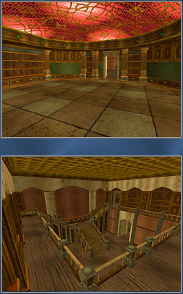 Uncanny Estate is an interior-only manor-style house. It features an open entryway room with larger rooms to the left and right. A secret room is hidden beneath the stairs. Two large rooms flank the upper level when you reach the top of the stairs. A small indoor balcony overlooks the entryway room. There is a large bar in one of the lower-level rooms and an area suitable for building a fireplace in three of the four rooms.