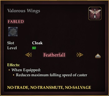 Valorous Wings 76,461 pages on this wiki Edit Edit source History Talk 2 In-Game Examine Window Valorous Wings Valorous Wings (Equipped) other resources EQ2U · LootDB · EQ2LL · ZAM · Census xml Valorous Wings FABLED NO-TRADE Featherfall Slot Cloak Level 80 ( Tier 9 ) Effects: When Equipped: Reduces maximum falling speed of caster.