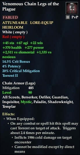 Venomous Chain Legs of the Plague 76,461 pages on this wiki Edit Edit source History Talk 0 In-Game Examine Window Venomous Chain Legs of the Plague other resources EQ2U · LootDB · EQ2LL · ZAM · Census xml Venomous Chain Legs of the Plague FABLED ATTUNABLE LORE-EQUIP HEIRLOOM +67 agi +22 wis +45 sta +2,511 vs elemental +1,535 vs noxious 14.5% Crit Bonus 4% Potency Torrent II Chain Armor ( Legs ) Mitigation 485 Level 90 ( Tier 10 ) All Scouts , Berserker , Guardian , Paladin , Shadowknight , Inquisitor , Templar , Defiler , Mystic Effects: When Equipped: On any combat or spell hit this spell may cast Torrent on target of attack. Triggers about 2.0 times per minute. Inflicts 1986 cold damage on target encounter Must not be engaged in pvp combat Cannot be modified except by direct means Must not be engaged in pvp combat This item may not be used in a PvP zone.