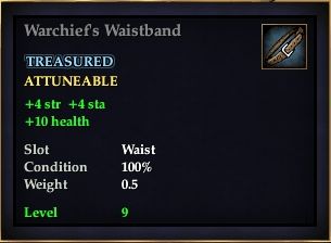 Warchief's Waistband 76,461 pages on this wiki Edit Edit source History Talk 0 In-Game Examine Window Warchief's Waistband other resources EQ2U · LootDB · EQ2LL · ZAM · Census xml Warchief's Waistband TREASURED ATTUNEABLE +4 str +4 sta Slot Waist Level 9 ( Tier 1 ) Obtain: From Dregh Brokentusk in Ruins . What does this information mean? Notes Edit Categories : Equipment Waist (Inventory Slot) Equipment pages with existing default images Treasured Equipment Tier 1 Equipment Fighter Equipment Warrior Equipment Berserker Equipment Guardian Equipment Brawler Equipment Bruiser Equipment Monk Equipment Crusader Equipment Paladin Equipment Shadowknight Equipment Mage Equipment Sorcerer Equipment Warlock Equipment Wizard Equipment Enchanter Equipment Coercer Equipment Illusionist Equipment Summoner Equipment Conjuror Equipment Necromancer Equipment Channeler Equipment Cleric Equipment Inquisitor Equipment Templar Equipment Druid Equipment Fury Equipment Warden Equipment Shaman Equipment Defiler Equipment Mystic Equipment Beastlord Equipment Predator Equipment Assassin Equipment Ranger Equipment Bard Equipment Dirge Equipment Troubador Equipment Rogue Equipment Brigand Equipment Swashbuckler Equipment Ruins Dropped Items Articles missing itemlink Add category Cancel Save