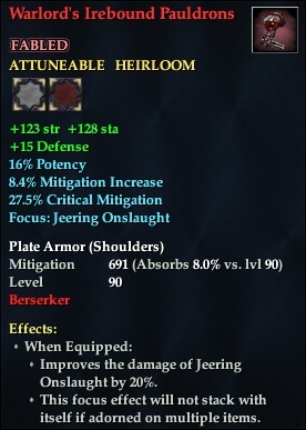 Warlord's Irebound Pauldrons 76,461 pages on this wiki Edit Edit source History Talk 0 In-Game Examine Window Warlord's Irebound Pauldrons other resources EQ2U · LootDB · EQ2LL · ZAM · Census xml Warlord's Irebound Pauldrons FABLED ATTUNEABLE HEIRLOOM +123 str +128 sta +15 Defense 16% Potency 8.4% Mitigation Increase Focus : Jeering Onslaught Plate Armor ( Shoulders ) Mitigation 691 Level 90 ( Tier 10 ) Berserker Effects: When Equipped: Improves the base damage of Jeering Onslaught by 20%. This effect does not stack with itself if adorned on multiple items.