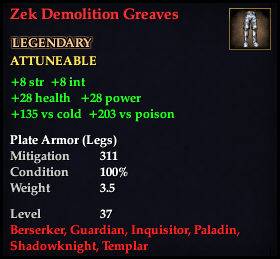 \aITEM 1689870666 -1677463335:Zek Demolition Greaves\/a