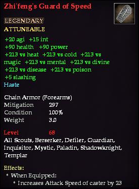 Zhi'feng's Guard of Speed 76,461 pages on this wiki Edit Edit source History Talk 0 In-Game Examine Window Zhi'feng's Guard of Speed other resources EQ2U · LootDB · EQ2LL · ZAM · Census xml Zhi'feng's Guard of Speed LEGENDARY ATTUNEABLE +20 agi +15 int +213 vs elemental +213 vs noxious +213 vs arcane +5 Slashing Haste Chain Armor ( Forearms ) Mitigation 297 Level 68 ( Tier 7 ) All Scouts , Berserker , Guardian , Paladin , Shadowknight , Inquisitor , Templar , Defiler , Mystic Effects: When Equipped: Increases Attack Speed of caster by 23